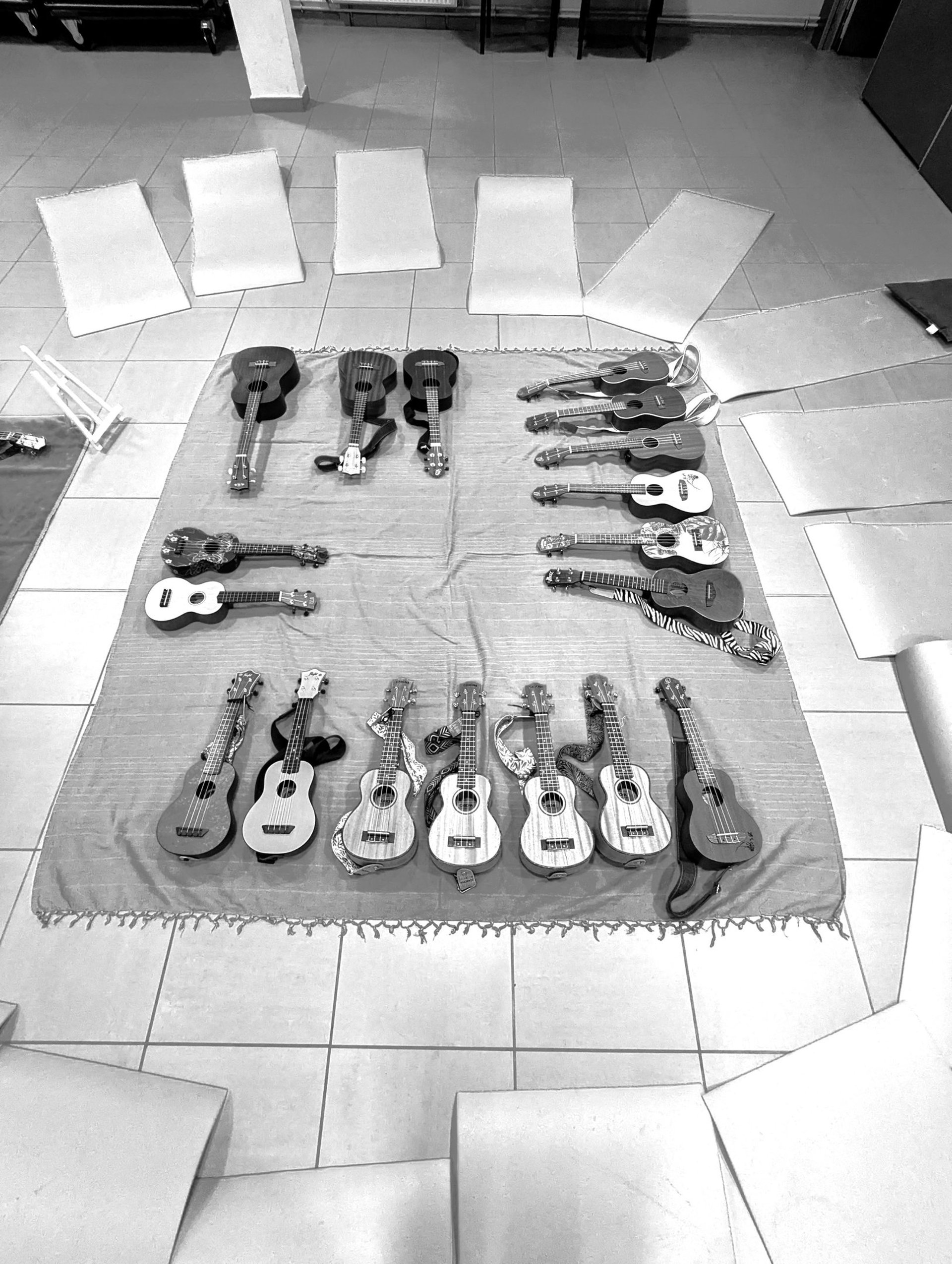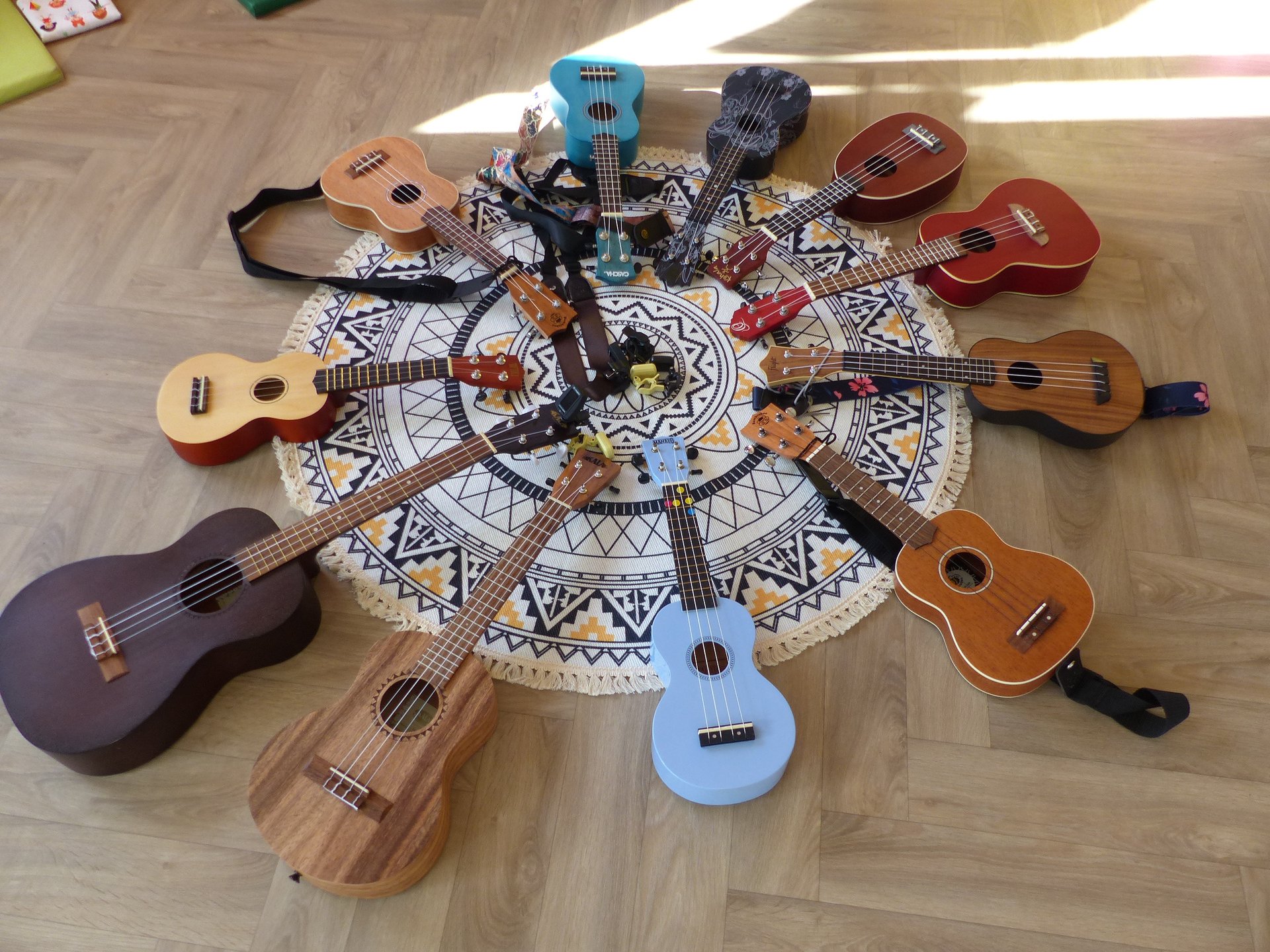 Je prête le jour J des ukulélés de différentes tailles/modèles.